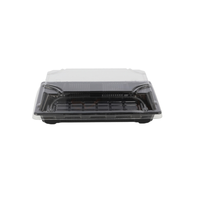 PET plastiko dėžutė su skaidriu dangteliu, idealiai tinkanti sušiams, užkandžiams, desertams ar kitam išsinešimui skirtam maistui. Tvirta konstrukcija ir sandariai priglundantis dangtelis padeda išlaikyti maisto šviežumą, apsaugo nuo išsiliejimo bei suteikia estetišką išvaizdą. Skaidrus dangtelis leidžia patraukliai pristatyti patiekalą be atidarymo.