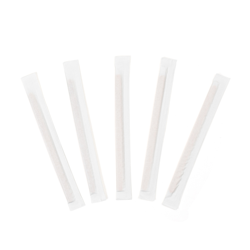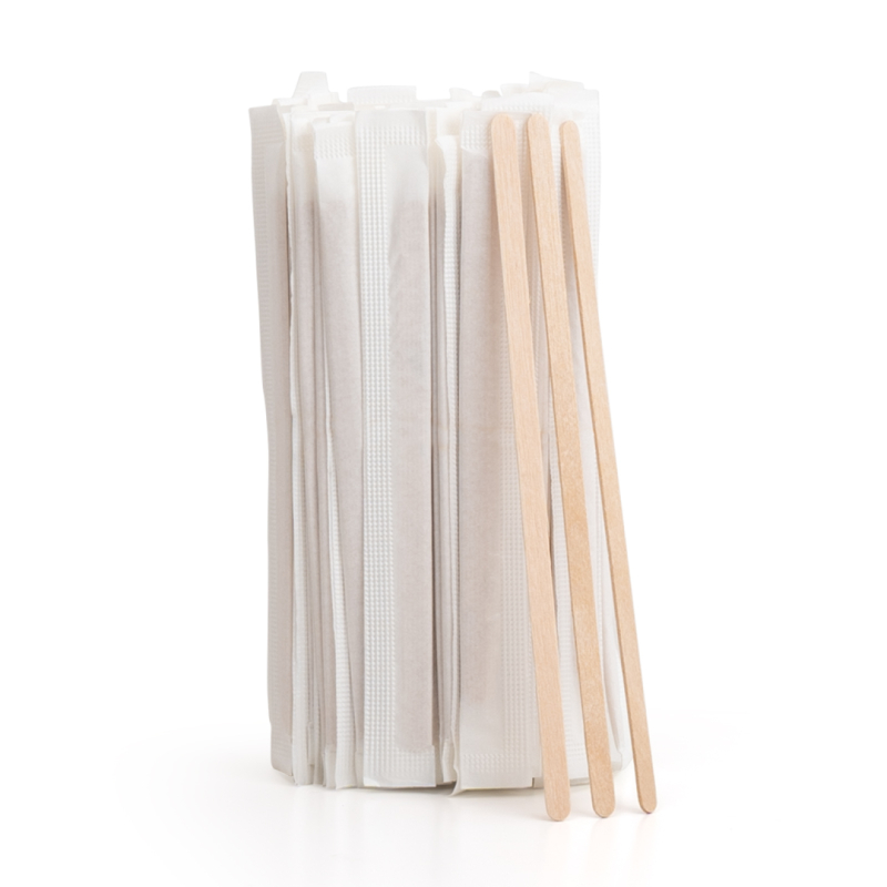 Vienkartiniai gėrimų maišikliai, pagaminti iš beržo medienos, individualiai supakuoti popieriuje.